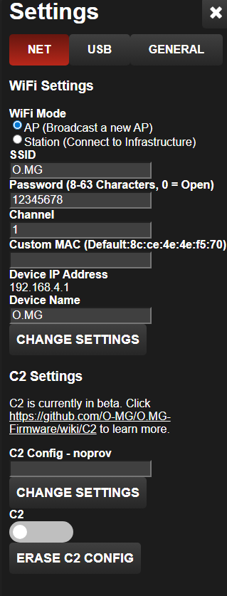 Going to the Settings, you have the option to change the OMG cables Wi-Fi settings. You can change the SSID, password, channel, and MAC address or you can change the OMG cable to connect to your existing Wi-Fi. There is also an option to connect to an OMG C2 server, but it is currently in beta. The OMG C2 allows you to connect to your OMG cable over the internet.