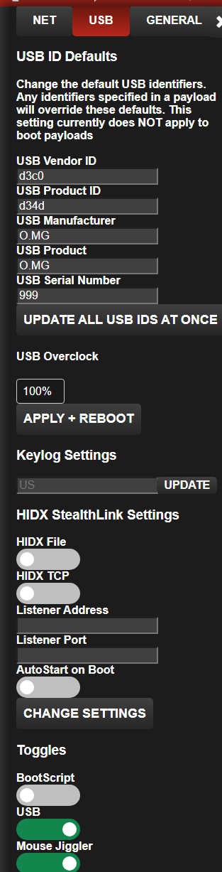 The USB settings allow you to configure hardware settings for the OMG cable. They also allow you to configure the Keylog and HIDX settings. If a keyboard is connected to a computer using the OMG cable, the OMG cable can act as a keylogger as well. It also allows you to use the OMG cable as a mouse jiggler. This helped me during testing by ensuring the host machine didn't go into sleep mode.