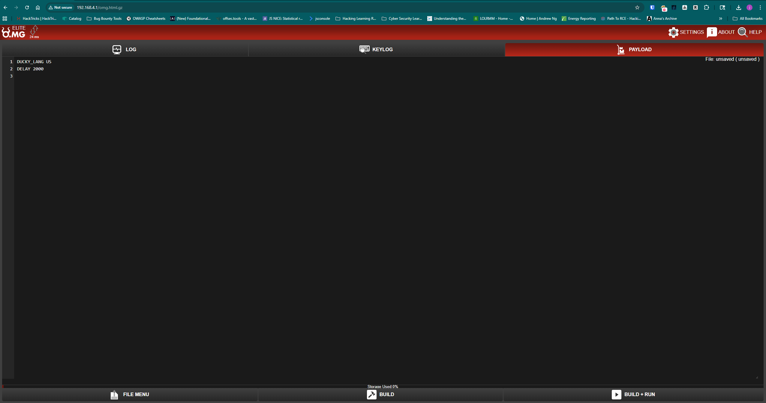 Upon opening the cable, I used the OMG Programmer and the Web Flasher to flash the firmware and make the cable usable. Afterwards I grabbed an extra Windows laptop and plugged the OMG Cable in. By default, the OMG cable acts as a hotspot creating its own network. After connecting to the OMG network, I opened a web browser and went to http://192.168.4.1. I was greeted with the OMG cable's web console.