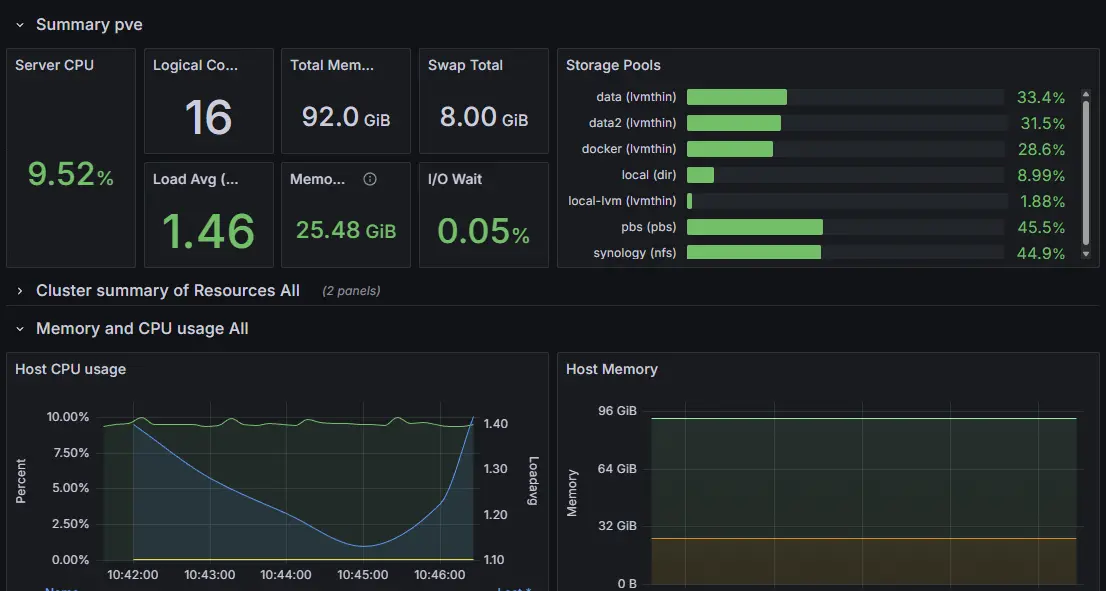 The next feature of Proxmox that I wanted to look into was a way to track virtual machine metrics. The Proxmox webui provides limited stats about the virtual machines and does not keep historical data. It does provide a built in way to send metrics to a metric server, such as InfluxDB or OpenTelemetry. I chose to use InfluxDB because I had already had it setup. It only took me about 10 minutes to connect Proxmox to InfluxDB and the InfluxDB to Grafana. Afterwards, I had a nice dashboard that display several stats and could provide historical data. You can tell InfluxDB to keep your data for as long as you want when you create the storage bucket, but I went with 30 days.